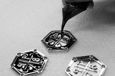 对于一些需要抹油和滴胶的产品,谐达使用环氧树脂水晶滴胶,除了增加其表面光泽与亮度,以及表面装饰效果外,还可以对制品表面起到良好的保护作用。谐达的滴胶操作现场是标准的6S无尘车间,配以空气湿度和温度调节器,避免因湿气太重而造成胶水表面被氧化成雾状或气泡难消,以及温度过低或过高影响胶水固化和使用时间。