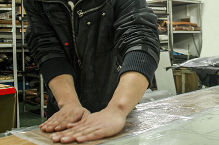 因为皮的部分材料太厚,车线、折边、装配等工序操作起来不便,效果不好,所以对皮料进行铲薄。谐达的工匠会根据皮料厚度与产品而异,对照工艺要求调整铲皮的厚度与宽度,确保厚度一致,宽度均匀,底层没有波纹及凹凸不平现象。