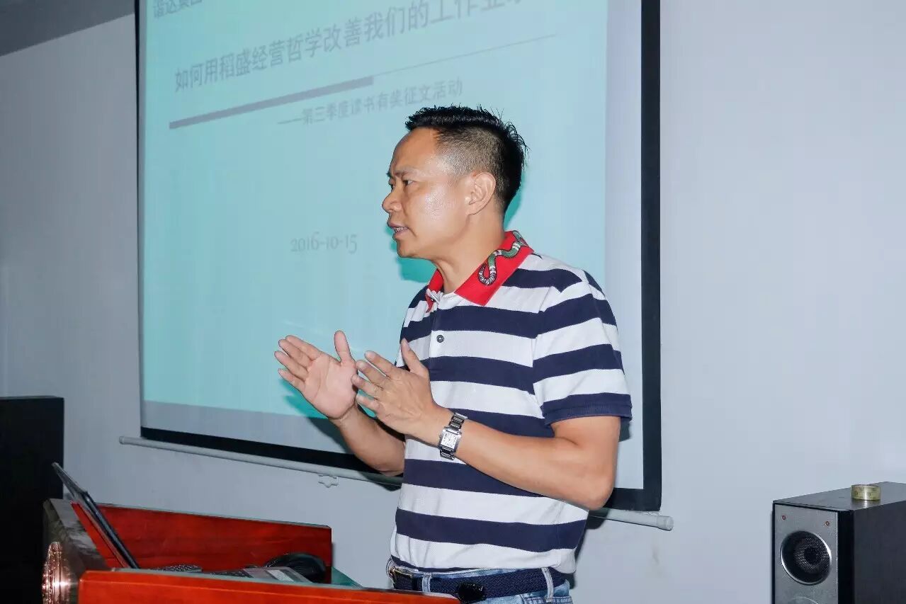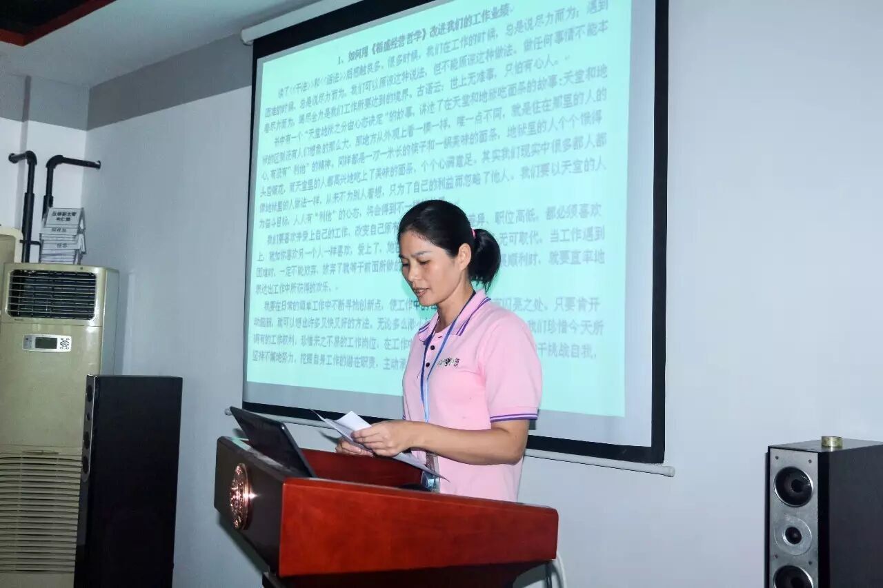 俗话说:“书读三遍,其义自现”,当我们真正把书本中所学到的知识运用到我们的日常工作生活中来的时候,我们发现,很多事情都变得简单,效率。每个人都发自内心的有了改变,工厂技术人员的发言,通过对技术创新的提议,和对自身的工作要求标准获得了大家的掌声;品质管理人员的发言通过翔实的例子,深刻的道理,深入的阐述了细节在个人素质、团队协作、企业管理等各方面体现出的巨大价值;销售部同事的发言通过结合自身实际,有感而发,让每一个与会人员都感触颇深,受益匪浅.......